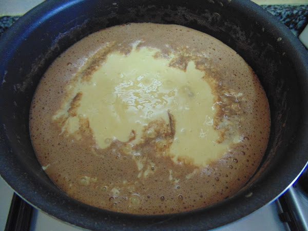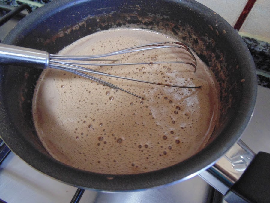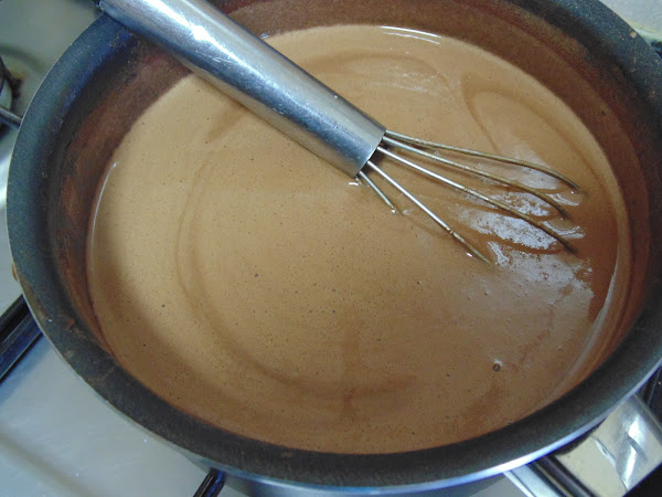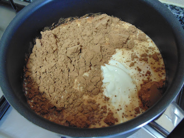 A continuación vertemos en el cazo la leche, la nata (crema de leche), y el cacao en polvo. Removemos a fuego lento.