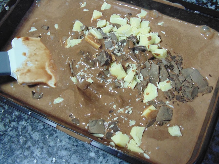 La dinámica va a ser la siguiente: una vez en la tarrina, ponemos en el congelador y removemos cada tres cuartos de hora en las próximas 3 horas para que no cristalice. La última vez que vayamos a removerlo, le añadimos el chocolate troceado, los frutos secos, lacasitos, lo que más os guste. Mezclamos bien y ya dejamos que congele completamente.