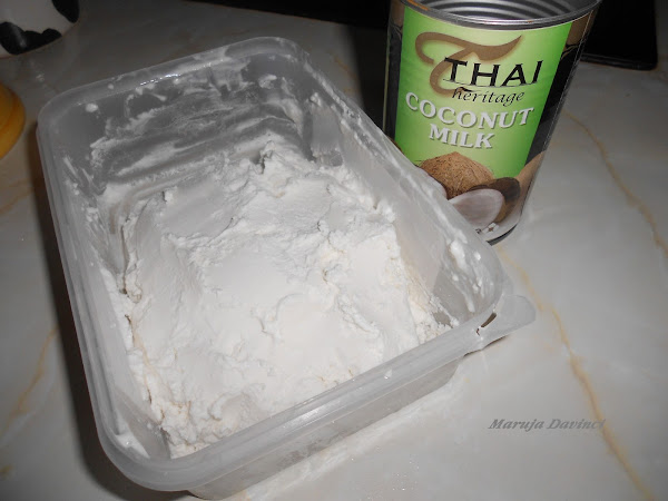 En esta ocasión venía leche de coco Thai , especial para cockteles, pero yo soy ,muy lanzada e hice dos paltos con ella un primero(ya lo pondré) y un postre, helado de coco y quedó riquisimo.