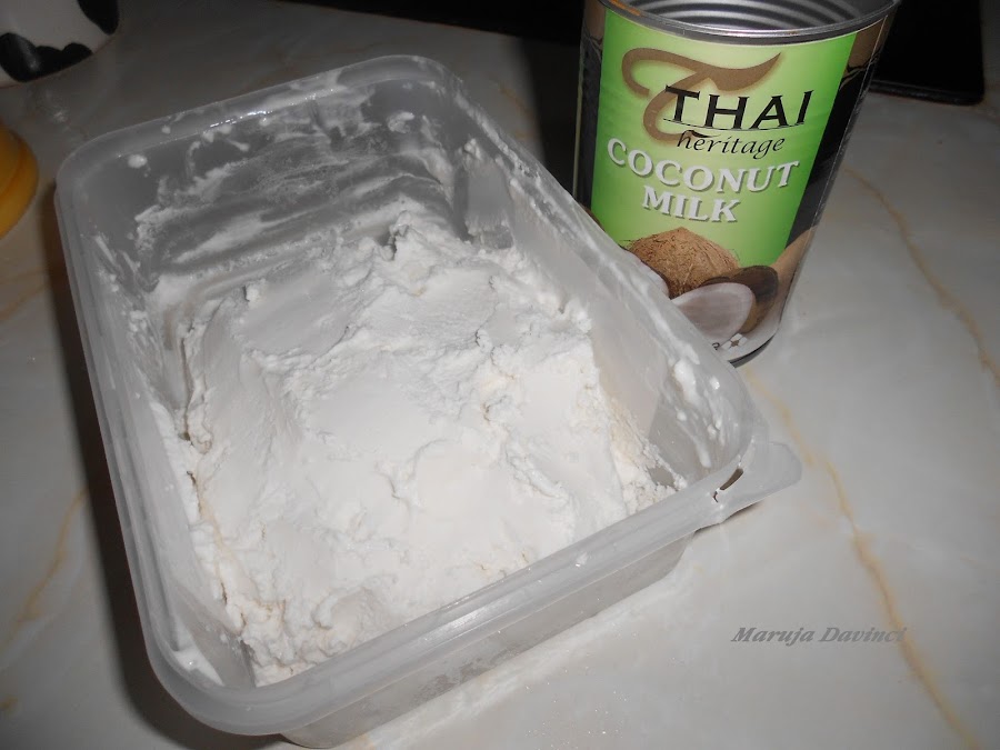 Montar la nata (crema de leche) bien fría junto con la sacarina y mezclar con la leche de coco con suavidad.
