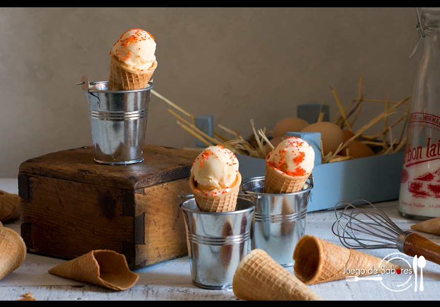 Me quedo extasiada ante estas heladerías que parecen paletas de colores. ¡Y pensar que antes sólo había helados de vainilla, chocolate y fresa y nos parecían el no va más! Te los servían sobre un cucurucho de barquillo comestible que te dejaba un regustito inolvidable. Eran helados que había que comer rápidamente pues de lo contrario empezaban a derretirse formando churretes sobre la mano. Luego aparecieron esos vasitos de distintos tamaños y precios que siempre iban acompañados de una ridícula cucharita en forma de pala, pero ya no era lo mismo. No te ensuciabas las manos, de acuerdo; pero una vez comido siempre faltaba aquel saborcillo tan peculiar del cucurucho. Pues bien, con este helado de crema de limón y canela presentado de esta manera echamos una mirada al pasado pero sin renunciar a seguir haciendo helado de cereza, helado de leche merengada, helado de frutos del bosque o helado de vainilla. Es más, justo ahora empieza el verano y os amenazamos con hacer helados de más sabores. ¡Quien avisa no es traidor!