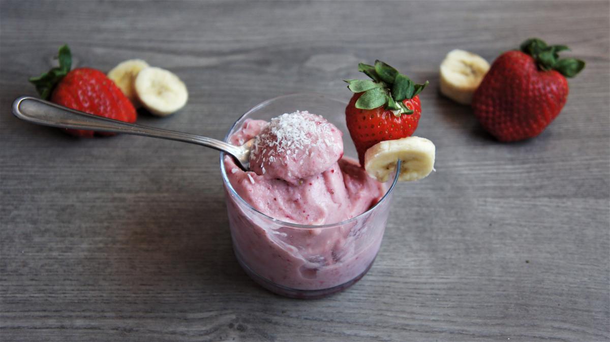Echamos el plátano y las fresas congeladas y el yogur en una batidora potente y trituramos hasta obtener una textura cremosa (si es necesario añadir un poquito de leche).