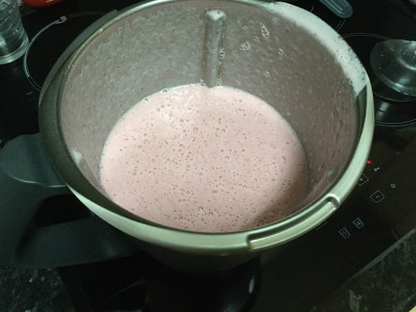 Cogemos la batidora y en el vaso le ponemos las fresas lavadas y cortadas, los plátanos cortados, la leche y el azúcar.