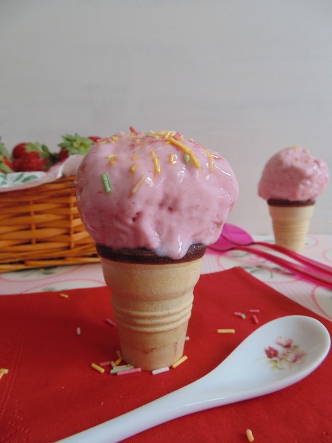 Creo que es la receta más fácil de todas las que he puesto en el blog, ya que solo tenemos que triturar todos los ingredientes juntos con la ayuda de una batidora de mano normal y corriente. Si queremos que nos quede una crema aterciopelada, podemos colar la preparación para quitarle las pepitas de las fresas, pero tengo que confesar que a mi me encanta encontrarlas en mi helado: son una prueba inconfundible de que es un helado hecho con frutas de verdad. A partir de aquí, podemos preparar nuestro helado con o sin heladora. No hay duda de que queda con una mejor textura si lo hacemos con una heladora, siguiendo las instrucciones de vuestro aparato. Pero si no la tenemos podemos prepararlo igual y substituir el aparato por toda la paciencia que nos hará falta para sacar el helado del congelador cada hora y batirlo manualmente o con la batidora, para ir rompiendo los cristales que puedan formarse. En total deberá estar en el congelador un mínimo de 4 horas, lo que significa que tendremos que sacarlo para batirlo 4 veces. Si está más tiempo necesitaremos batirlo más veces. En cualquier caso, valdrá la pena porque es delicioso.