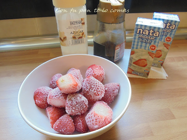 1. Sin necesidad de descongelar las fresas las colocaremos en el robot o batidora, añadimos el resto de ingredientes y trituramos hasta hacer una crema.