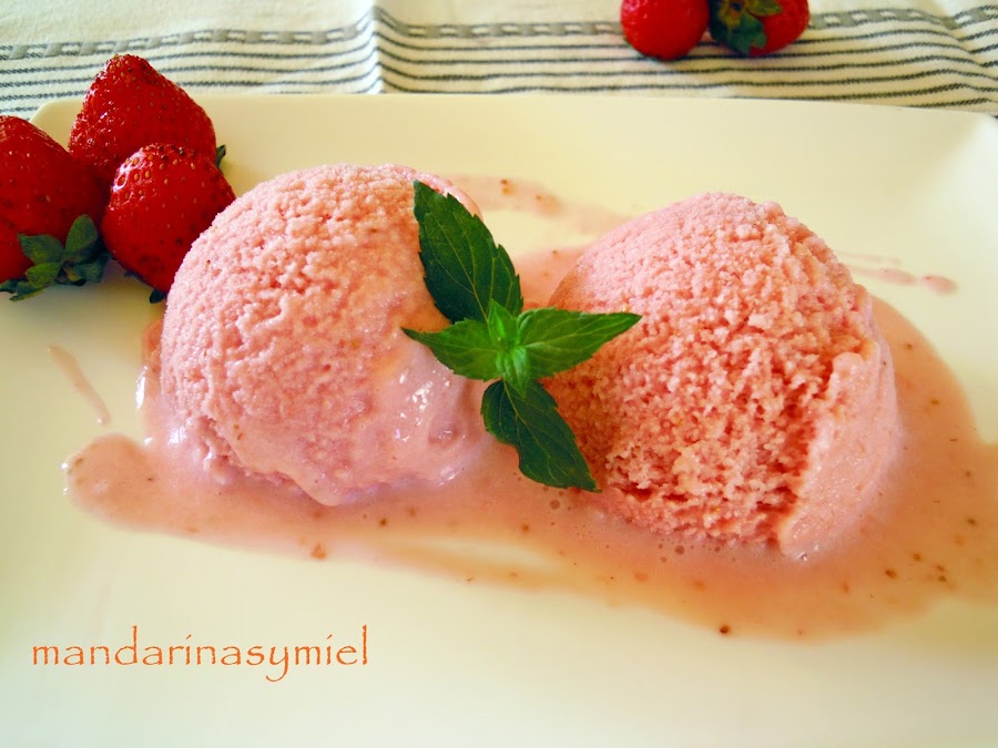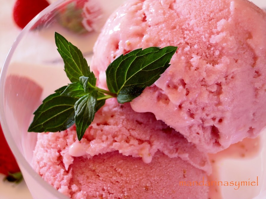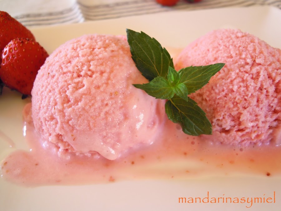 Desde hace días que mi marido no para de pedirme que le haga helado de fresas, le digo que no es fácil encontrarlas ahora, pero el otro día fuimos a Makro y como allí hay de todo, las compramos y aquí está este riquísimo y sabroso helado de fresas.