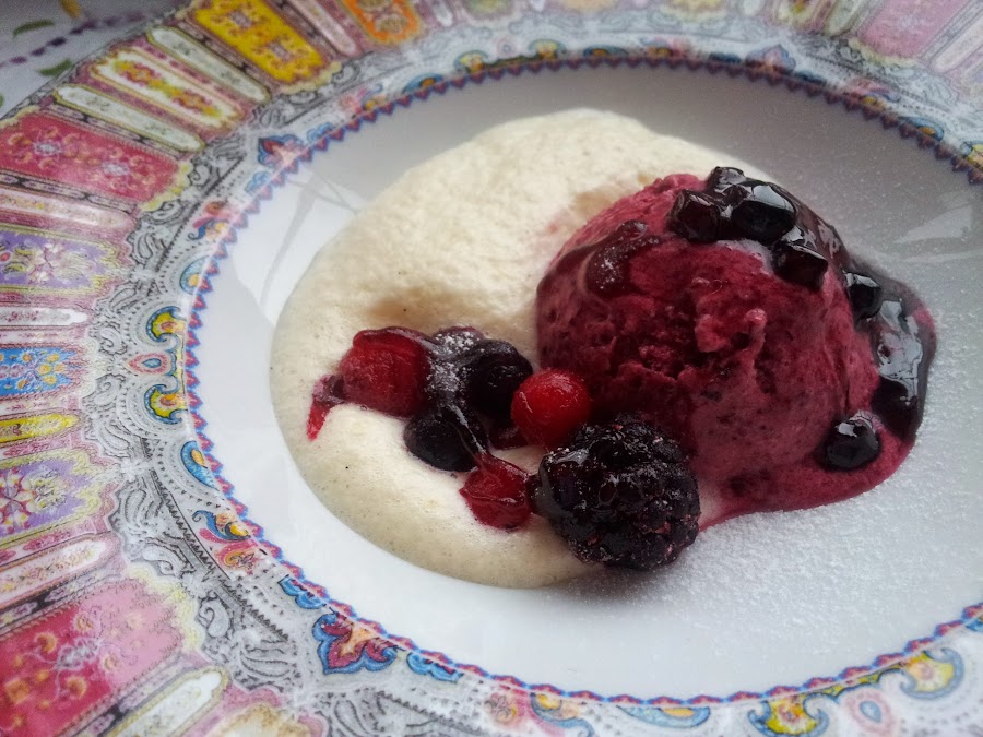 Colocar unas cucharadas del sabayón en un plato hondo o copa. Poner encima una bola generosa de helado y adornar con unas frutas, que previamente habremos dejado descongelando. Tenía hecho un coulís de frutos del bosque y se lo he añadido para darle otra textura, pero no es necesario. También podéis espolvorear azúcar glass y poner unas hojitas de hierbabuena.