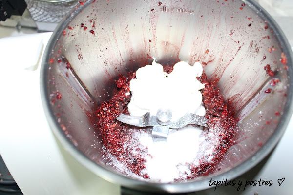 Ponemos en el vaso los frutos del bosque con la mitad del azúcar. Trituramos 30 segundos a velocidad 8-10. Agregamos el resto del azúcar y los yogures y volvemos a triturar 1 minuto a velocidad 10. Debe quedar un puré espeso y homogéneo.