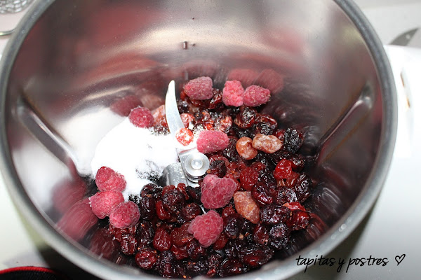 Vamos a poner los frutos secos y las frambuesas en el vaso con la mitad del azúcar.