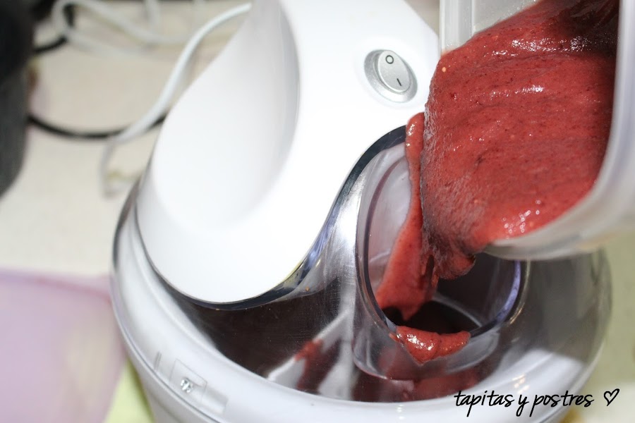 Vertemos la mezcla en la heladera y dejamos que funcione unos 40 minutos. Luego al congelador.