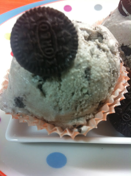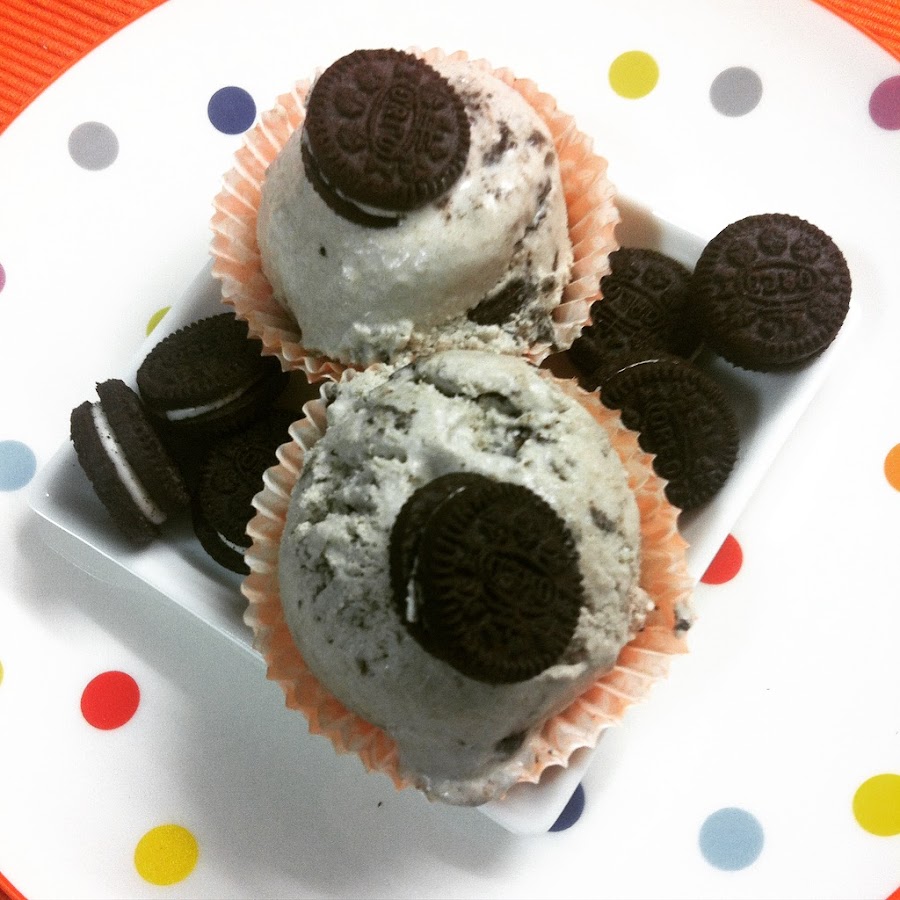 Cuando se vaya a servir se templa un poco para hacer bien las bolas y se decora con una galleta mini-Oreo.