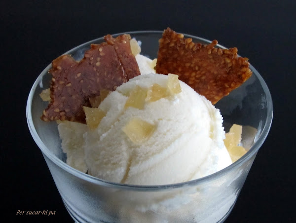 En una copa colocar un par de bolas, decorar con trocitos pequeños de jengibre confitado y con un par de tejas de guirlache de sésamo.