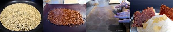 Colocar el azúcar en la sartén y preparar el caramelo. Cuando empiece a derretir añadir unas gotas de limón, y cuando vaya cogiendo color verter el sésamo y remover. Retirar y colocar sobre una superficie de silicona. Estirar rápidamente antes de que se enfríe y solidifique. Colocar encima otra superficie antiadherente (papel de horno por ejemplo) y aplanar con un rodillo hasta conseguir una capa fina y uniforme. Dejar enfriar antes de cortarla.