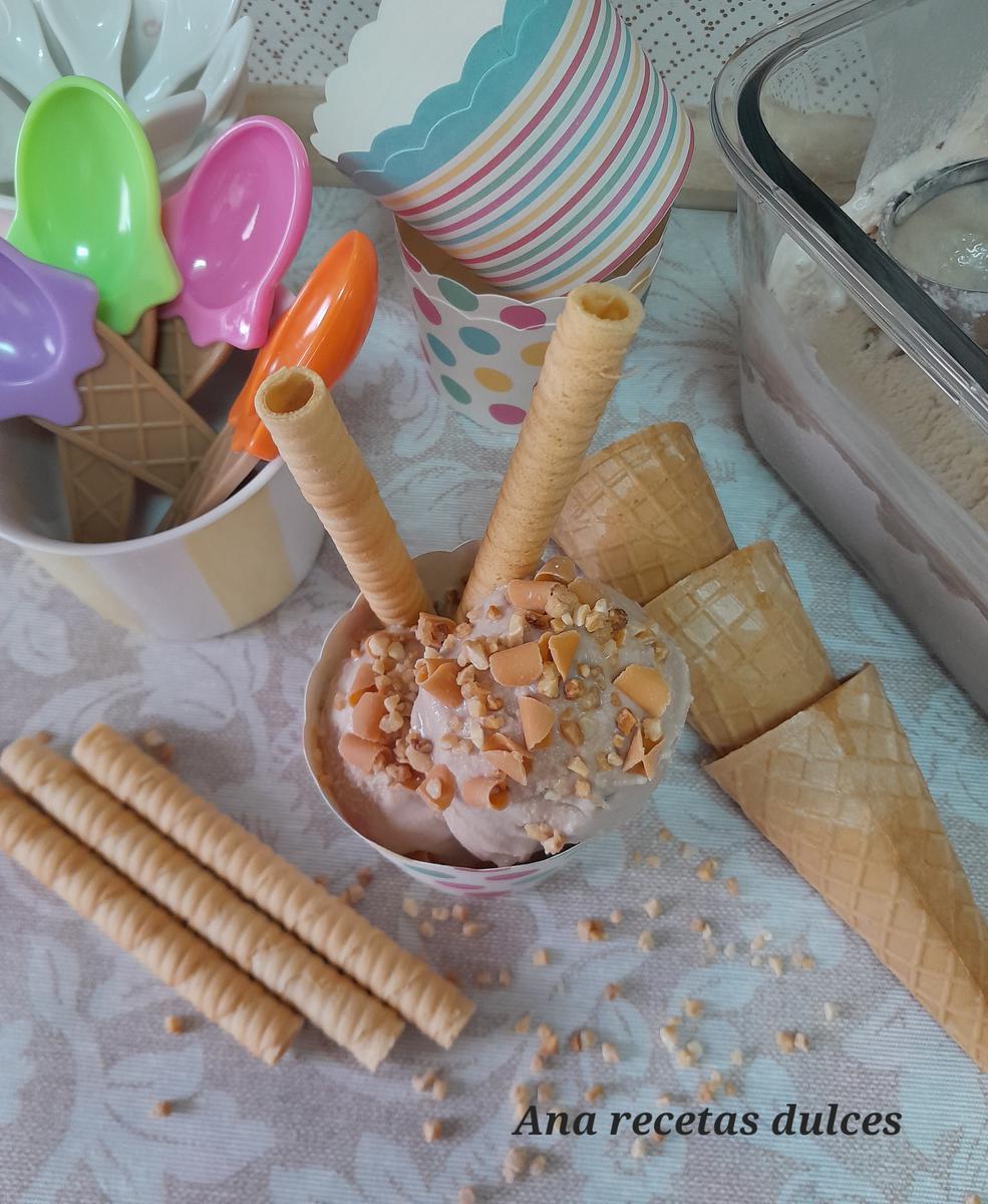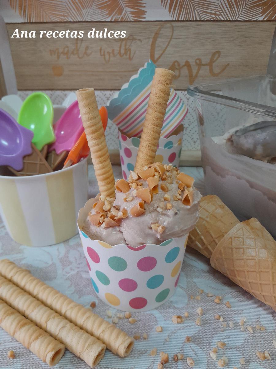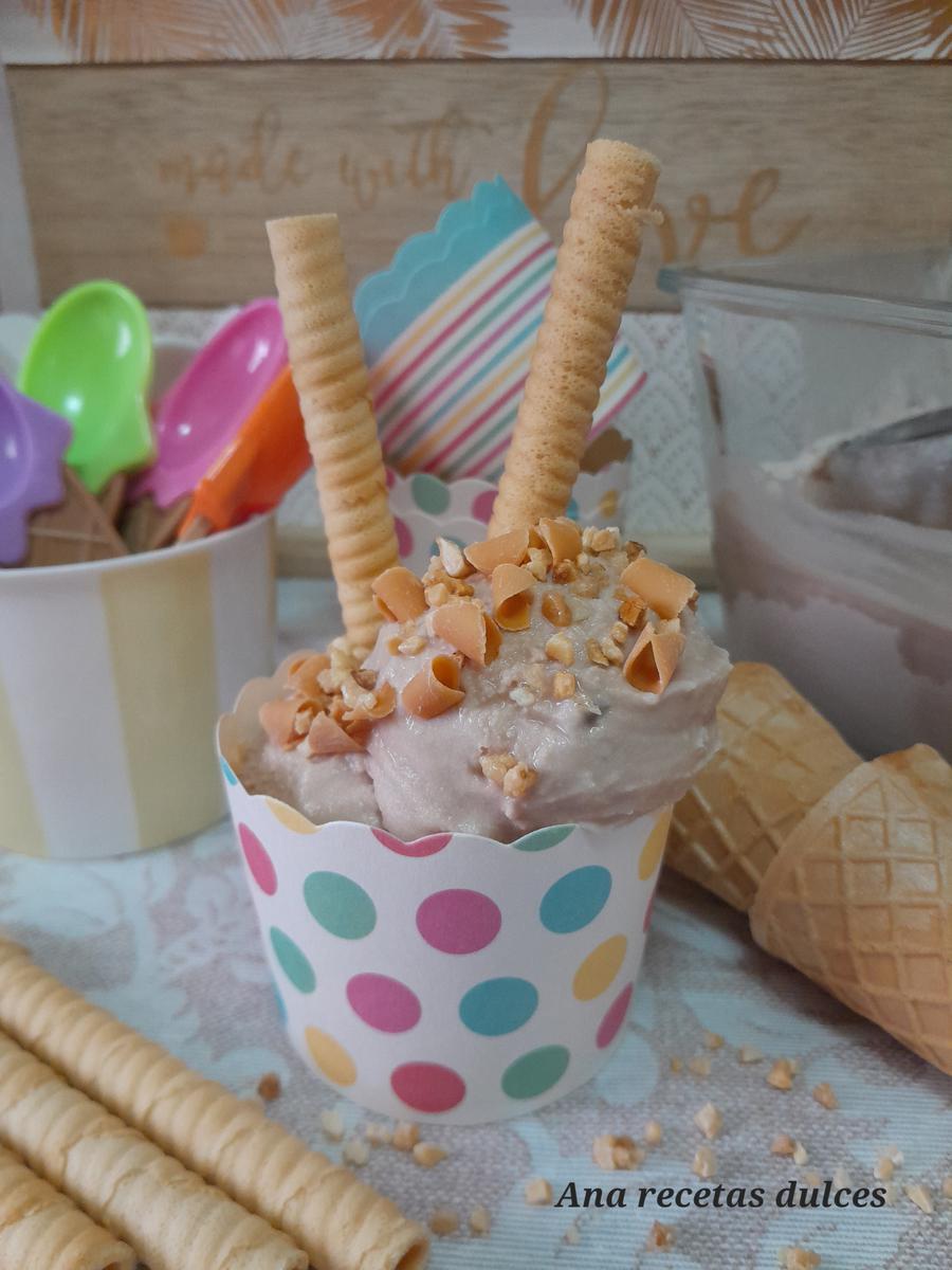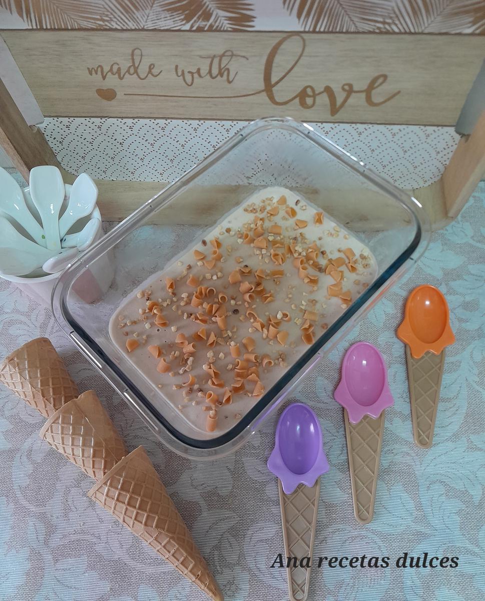 Una vez listo vertemos en un recipiente, alisamos la superficie y decoramos con almendras caramelizadas crocanti y virutas de chocolate de caramelo, tapamos y metemos en el congelador hasta el día siguiente, (en caso de no tener heladera, simplemente lo llevamos al congelador y para que no cristalice sacamos a la media hora y mezclamos con unas varillas de manos o eléctricas, repitiendo el proceso tres veces más, en el último mezclado añadimos los 50 gramos de barritas kinder troceadas en pequeños trocitos, mezclamos hasta integrarlas y por último decoramos).