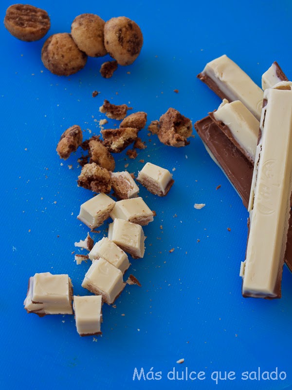 Trocear las cookies y las barritas de KitKat y reservar.