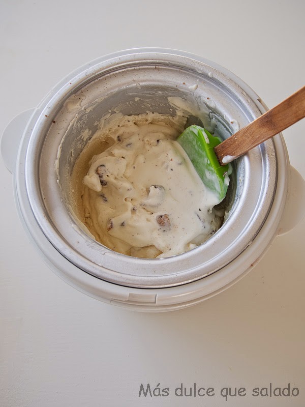Verter la mezcla en la cubeta de la heladera, que habremos tenido durante al menos 24 horas en el congelador, y mantecar (unos 15 minutos)