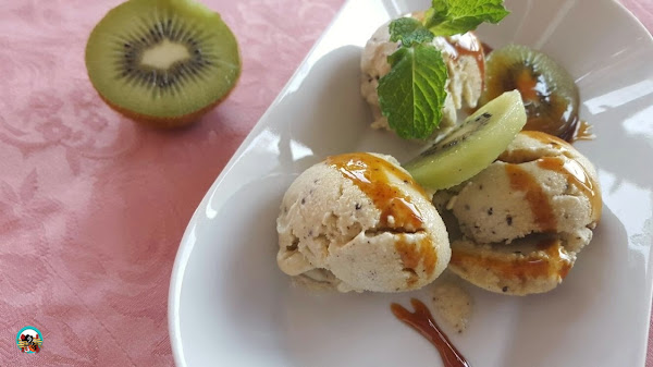 3.- Preparamos el helado: Sacamos la fruta del congelador, la trituramos con el almíbar frío y el yogur hasta que este la fruta cremosa. La vertemos en un molde con paredes bajas, la tapamos con papel flim y guardamos en el congelador 3 horas más. Sacamos 10 o 15 minutos antes de servir para que este cremoso. Servimos con una rodaja de kiwi, una ramita de hierbabuena y un poco de sirope de de caramelo por encima.