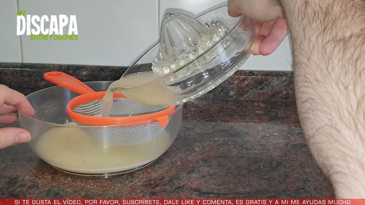 2 Ahora vamos a sacarle el zumo al limón y añadirselo a la leche condensada, usaremos un colador para que no caiga ni la pulpa ni las posibles semillas que pueda tener el limón. Si queréis le podéis añadir más limón para que tenga un sabor mucho más potente a limón.