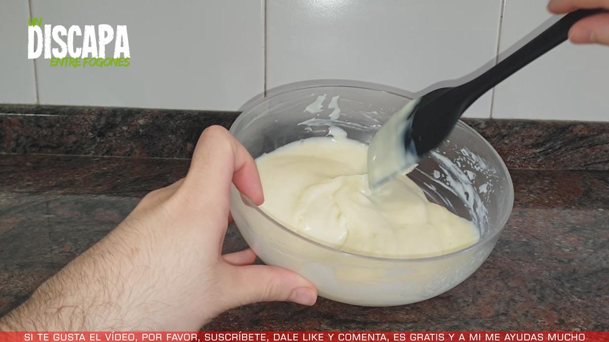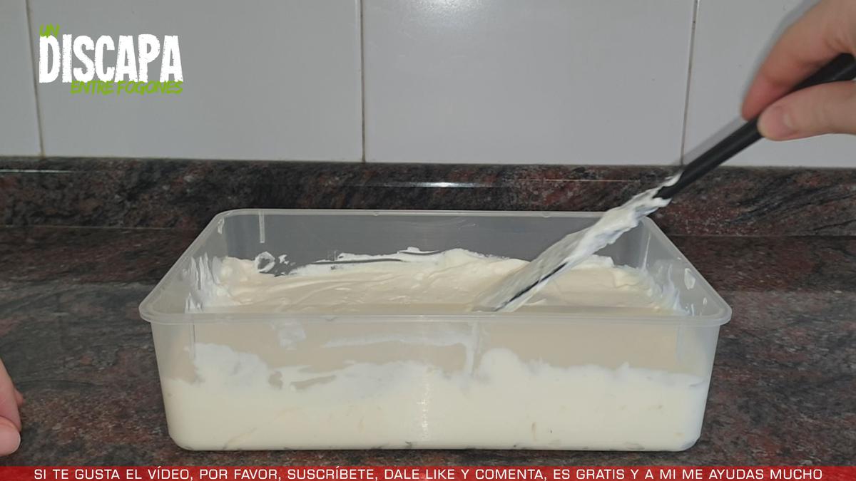 6 Ahora que ya tenemos todo bien mezclado, lo vertemos en un recipiente, procurando que quede lo más liso posible. Le ponemos la tapa al recipiente y lo metemos en la nevera unas 8 horas como mínimo. Yo lo voy a dejar toda la noche.