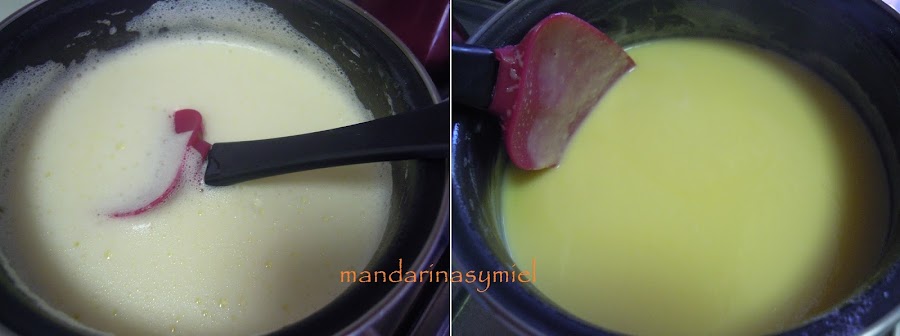 Remueve constantemente hasta que la crema espese, no debe hervir. Cuando veas que la espuma ha desaparecido, ya está.