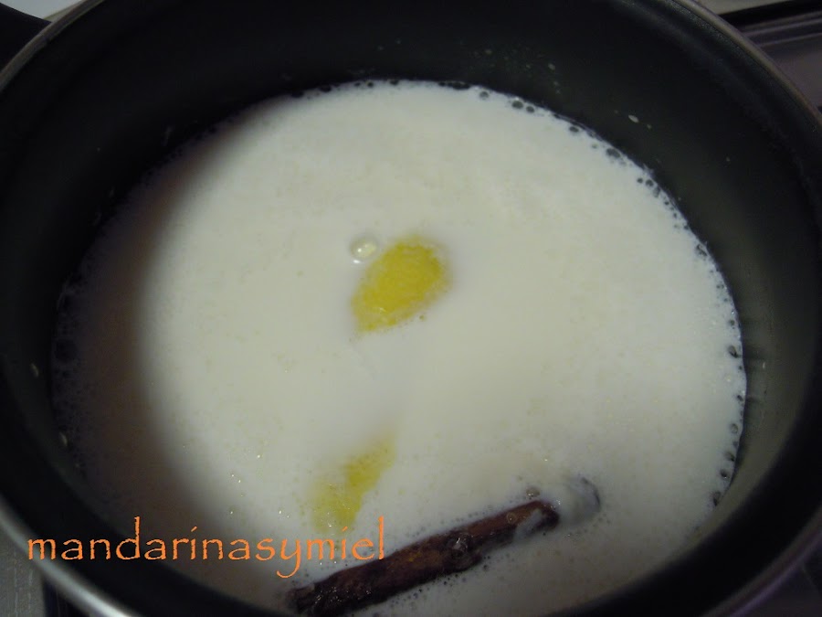 Hierve la leche con la canela y la corteza de limón (un simple hervor es suficiente), añade el azúcar, remueve para que se deshaga y tapa hasta que se enfríe la leche.