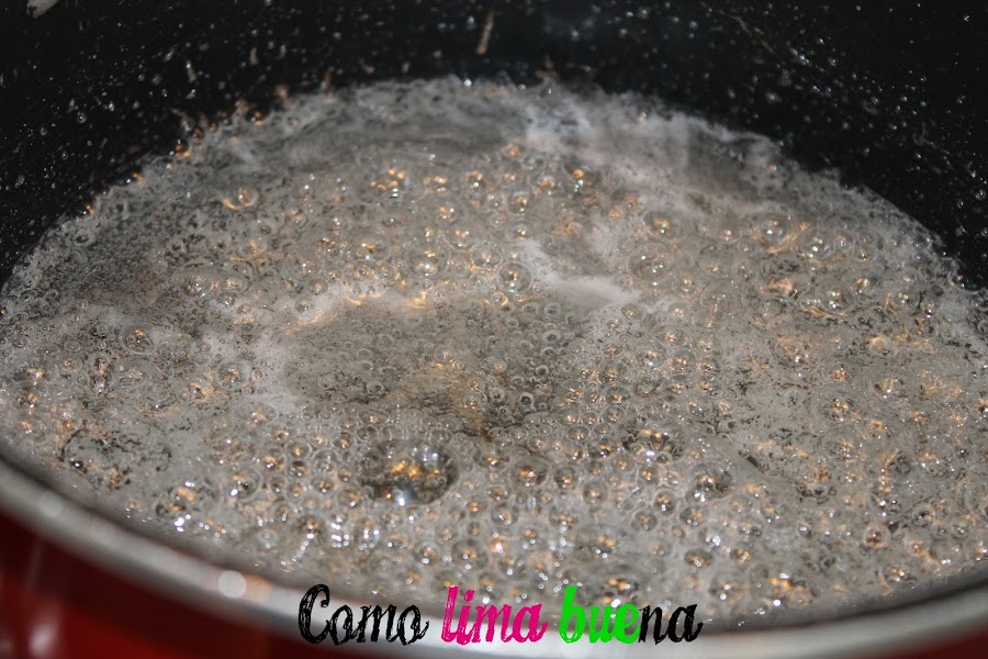 En una olla calentar el agua con el azúcar y realizar un almíbar. Cuando las burbujas lleguen al centro estará listo.