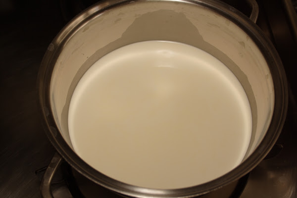 En un cazo ponemos a calentar la leche y la nata (crema de leche), retiramos del fuego cuando rompa a hervir. Reservamos.