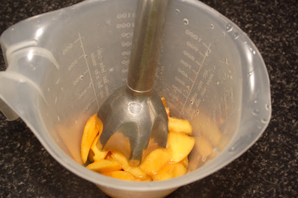 Limpiamos y pelamos los melocotones, trituramos con la batidora y los añadimos a la crema anterior.