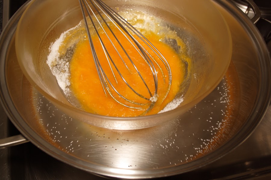 En un bol echamos las yemas de huevo y el azúcar. Colocamos el bol a baño María en una olla baja y ancha con agua y lo ponemos al fuego. Batimos con una varilla hasta que vaya quedando una crema homogénea.