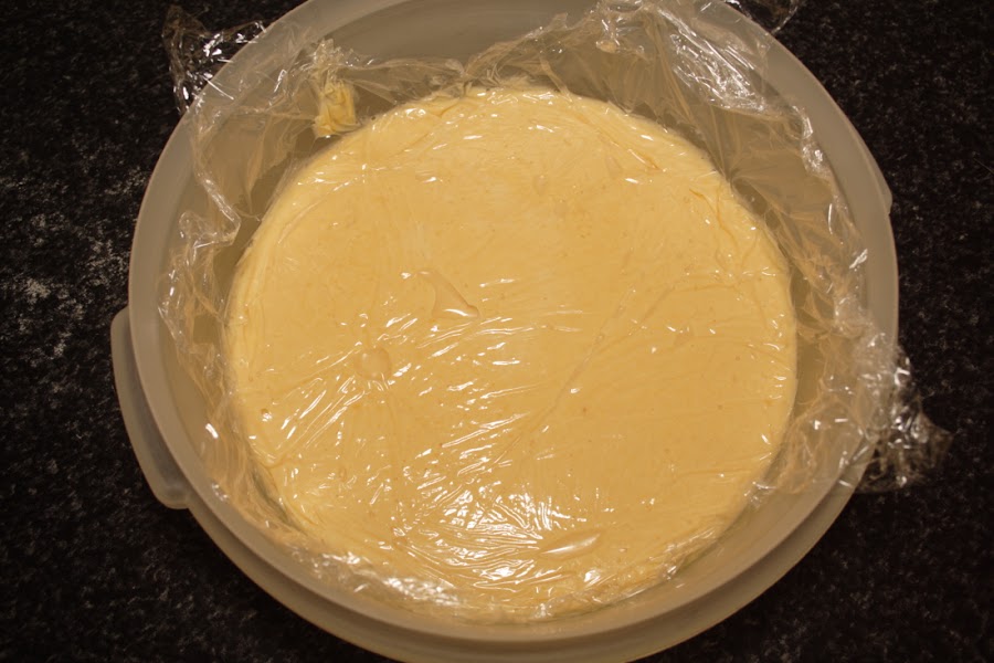 Removemos para que se mezcle bien todo y lo pasamos a: Como no tengo heladera ni cubitera que cierre herméticamente, lo paso a un táper, dejo que se atempere, lo tapo con film, de forma que quede pegado a la superficie para que no forme costra, y cierro bien con la tapa.