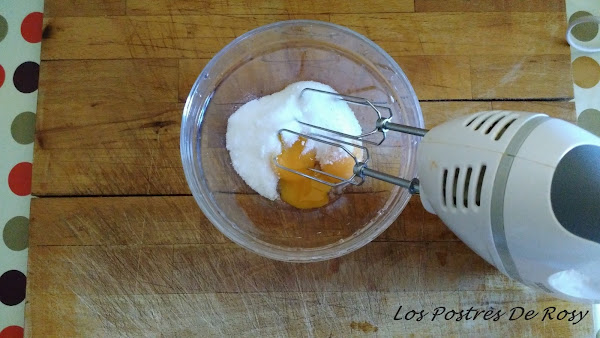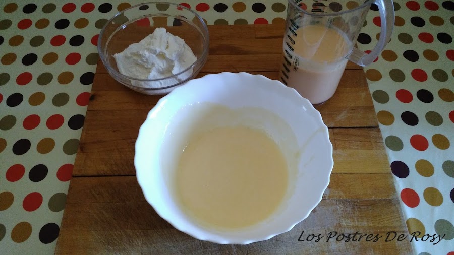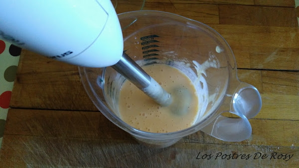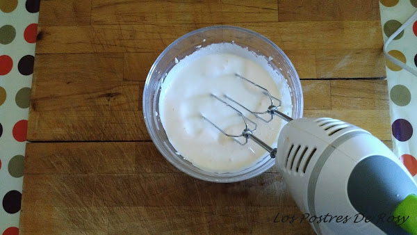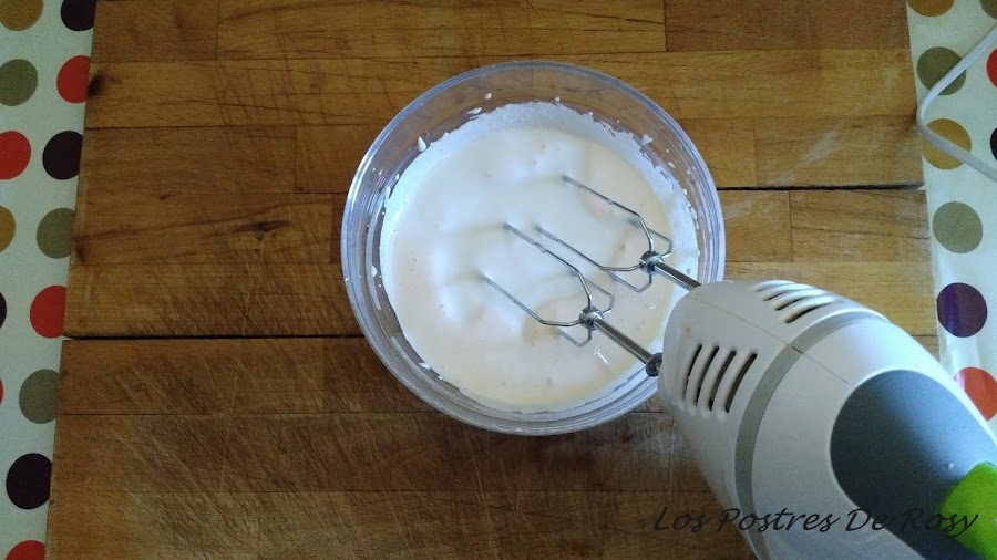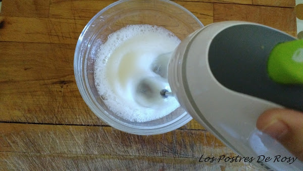 Montamos la nata (crema de leche) sin lactosa bien firme y llevamos a la nevera para mantenerla fría.