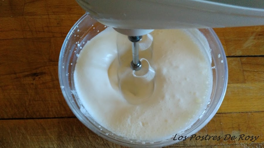 Montamos las claras a "punto de nieve" y reservamos también en la nevera.