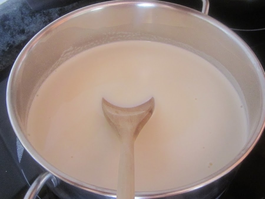 Ahora volvemos a poner la infusión al fuego, sin dejar que hierva, y vamos añadiendo poco a poco la mezcla de las yemas, sin dejar de remover para conseguir una crema lisa, tiene que quedar con la consistencia de unas natillas.