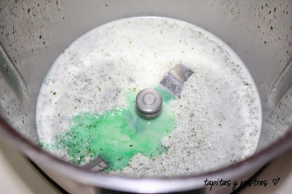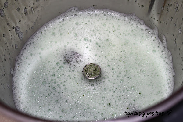Una vez fría, le añadimos el azúcar invertido y el colorante ( si usáis colorante verde no echéis mucho, yo usé dos gotas de amarillo y una de azul). Mezclamos 10 seg. vel.3. Dejamos enfriar por completo.