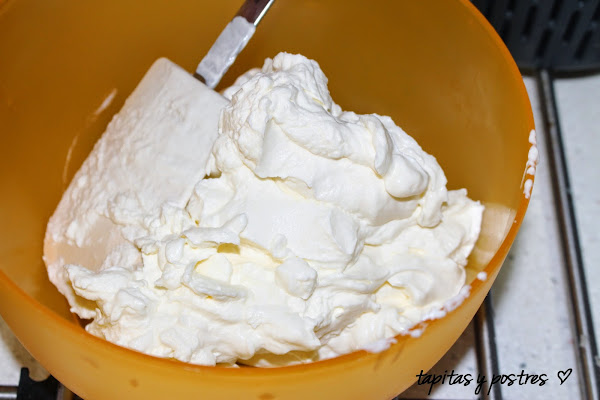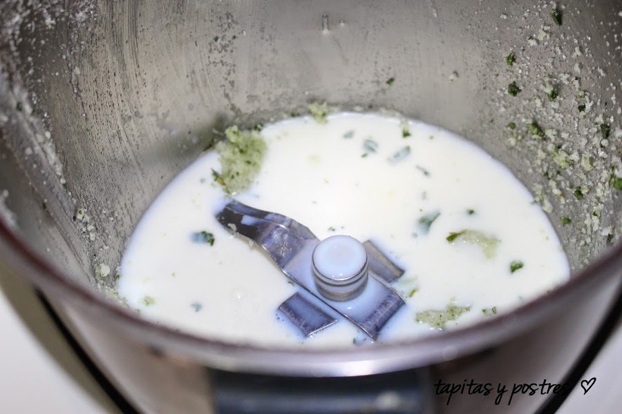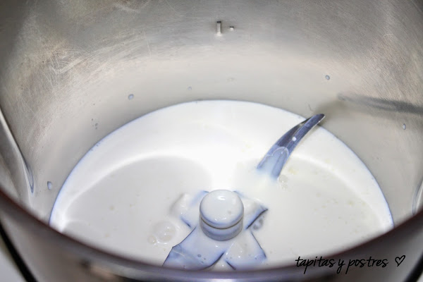 Echamos la nata (crema de leche) en el vado de la thermomix y la montamos durante 40 segundos a velocidad 4 1/2. (no la tengáis más tiempo que se convertirá en mantequilla). Reservamos en un bol en la nevera.