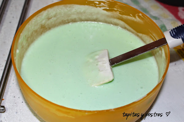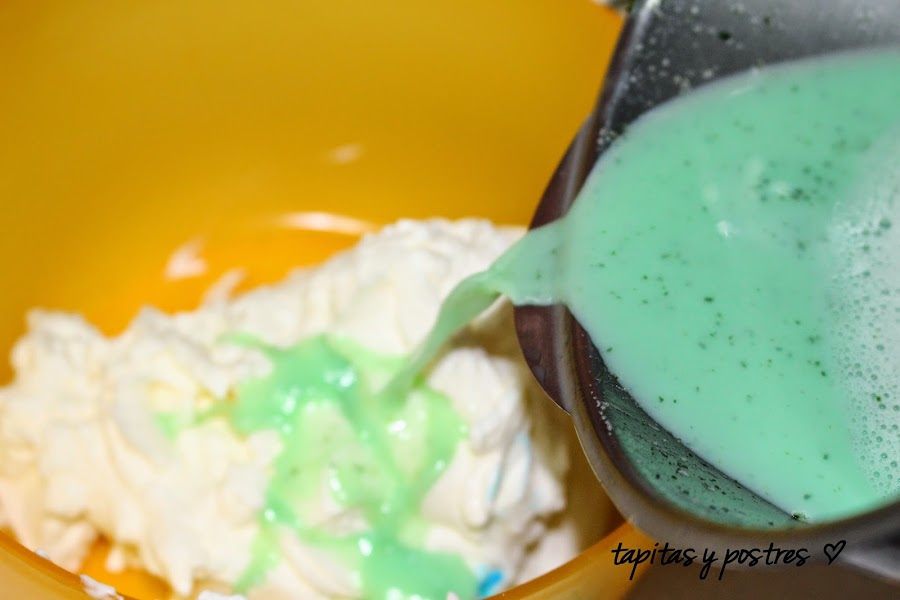 Ahora lo mezclamos con la nata (crema de leche), despacito y con movimientos envolventes. El bonito color verde se nos diluirá y quedará más claro. Si lo creéis necesario, echad un poquito de más colorante. Sin pasarnos.