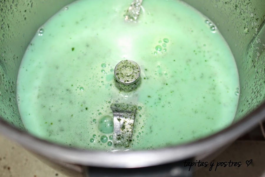 Añadir la leche y el licor de menta y cocemos 5 min. 100º, velocidad 2, sin cubilete, para que evapore el alcohol. Alrededor de los cuatro minutos, la leche empezará a subir, si veis que se va a desbordar apagáis la máquina, ya estará hecha. Una vez hervida la leche con el licor y el azúcar dejamos dentro del vaso que se enfríe unos 20 minutos.