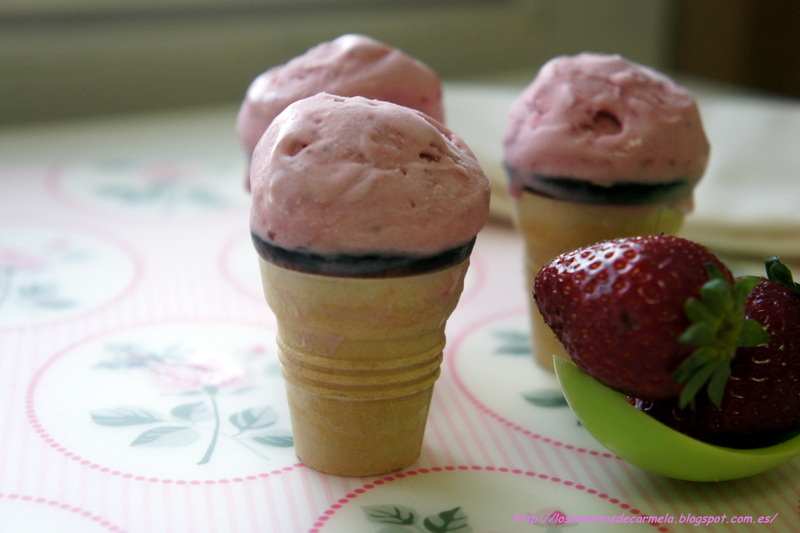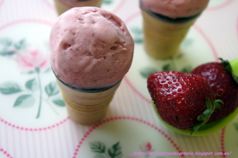 Mi peque ha trirepetido helado de fresas en conos mini, compré estos conos en Lidl, y para los peques de la casa van genial, porque les cabe perfectamente en la mano y como son tan diminutos no les da tiempo a derretirse, un éxito rotundo este helado, cremoso y llenito de sabor a primavera.