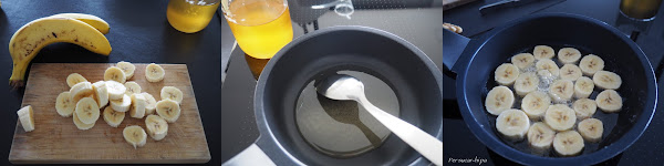Colocar un par de cucharadas de miel en una sartén al fuego y cuando empiece a calentar colocar las rodajas de plátano en una capa.