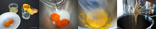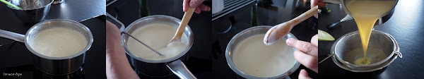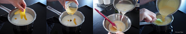 Batir las yemas de huevo junto el azúcar hasta obtener una crema blanca y espumosa. Colar la mezcla de leche y miel y desechar la piel de limón. Verterla sobre la crema de yemas y azúcar, y batir ligeramente para que se mezclen bien los ingredientes de la crema.