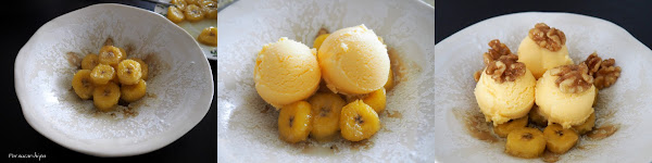 De su recetario hemos versionado este helado de miel, que combinado con los plátanos y las nueces, caramelizadas en miel (nuestra modesta aportación), lo convierten en un postre perfecto.