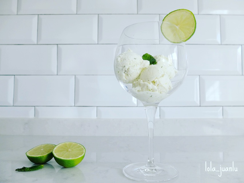 Servimos tres bolas de helado en una copa de balón, decoramos con unas hojitas de menta y una rodaja de lima.