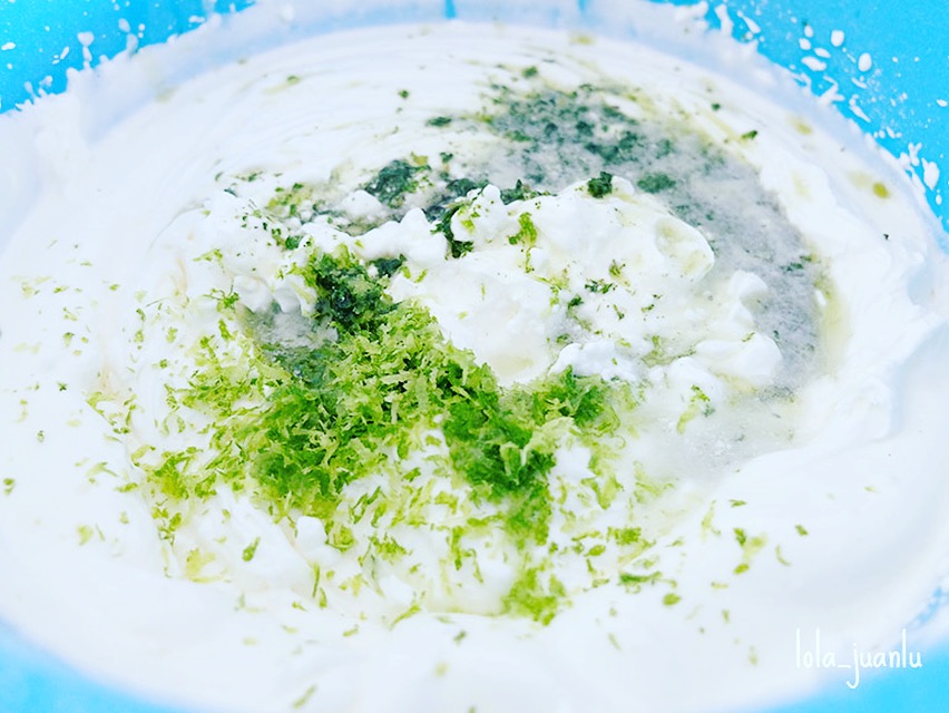 A continuación añadimos la ginebra, el zumo con las hojas de hierbabuena, la piel de las limas ralladas y la miel. Removemos, con movimientos envolventes, hasta que los ingredientes queden bien integrados en la nata (crema de leche).