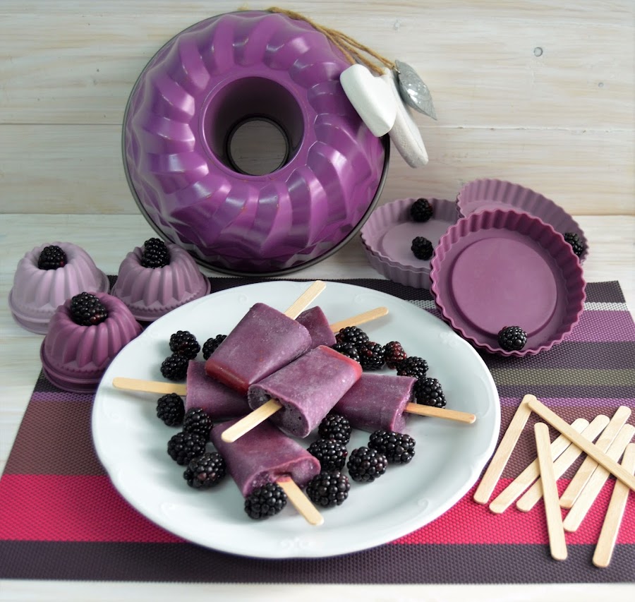 Ponemos todos los ingredientes en un bol y lo batimos muy bien, si queréis podéis colarlo para que no os encontréis pipitas de las moras y quede mas fino, yo no lo hice y me arrepentí. Lo ponemos en los moldes y lo metemos en el congelador durante una hora y media aproximadamente, le ponemos los palitos que al estar un poco congelado ya aguantaran de pie, volvemos a meter en el congelador al menos cinco hora.Luego, solo queda sacarlos y comerlos.