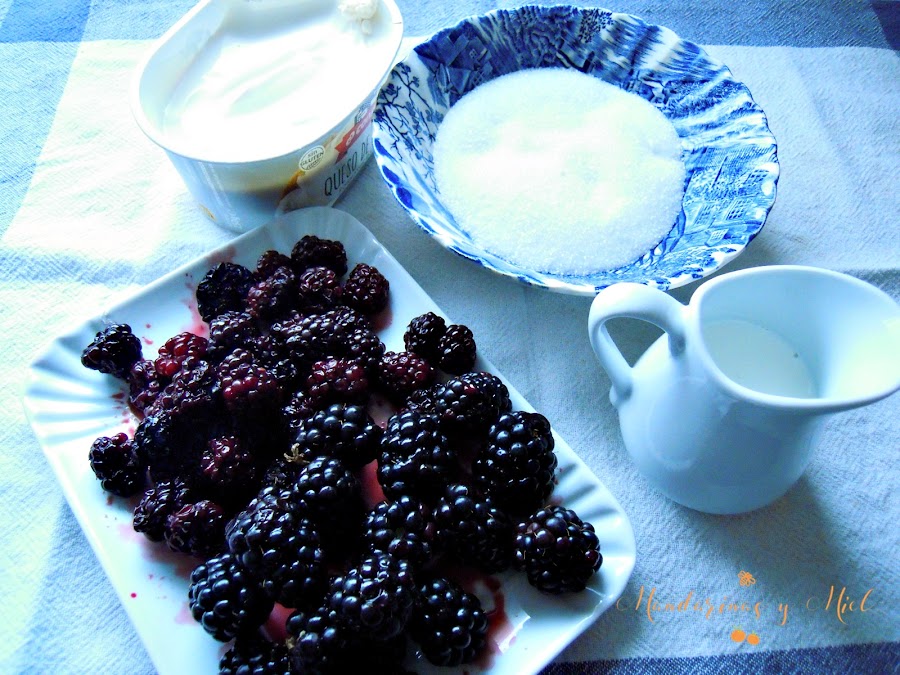 Ingredientes:Como no tenía suficientes moras silvestres compré una cajita de las que venden en el supermercado, son más grandes pero están también muy buenas.