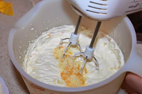 Montamos la nata (crema de leche) y cuando tome consistencia le añadimos poco a poco el azúcar aromatizada con la ralladura de naranja.