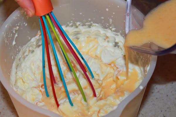 Cuando esté completamente montada le vamos añadiendo el zumo de naranja poco a poco, mientras mezclamos con unas varillas a mano.