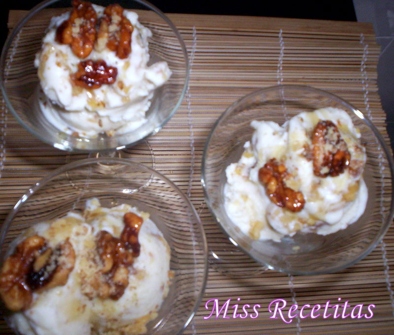 Una vez bien frio ponemos la heladera en marcha. Cuando vaya cogiendo consistencia añadimos las nueces picadas, apartando las que nos vaya hacer falta para decorar.