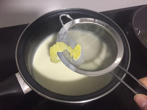 Una vez tengamos toda la piel de el limón, la ponemos en una olla con la leche, el azúcar y la canela, y lo dejamos cocer todo a fuego lento durante unos 10-15 min.