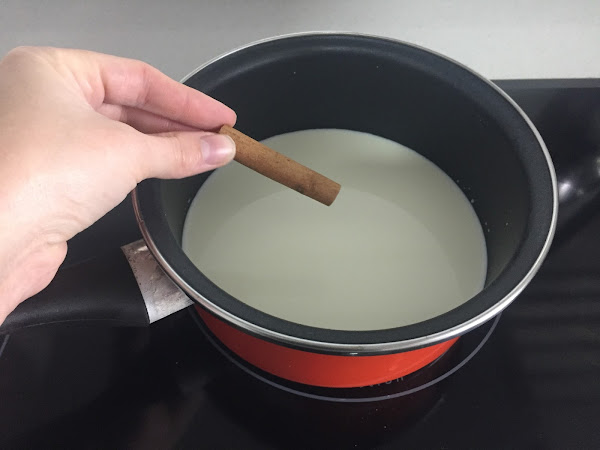 Pasado este tiempo, sacamos la piel del limón y la rama de canela, y añadimos la vainilla, y las tres yemas de huevo previamente batidas. Lo dejamos cocer otros 5 min a fuego medio sin dejar de remover y con cuidado de que no hierva. Apagamos y dejamos reposar.